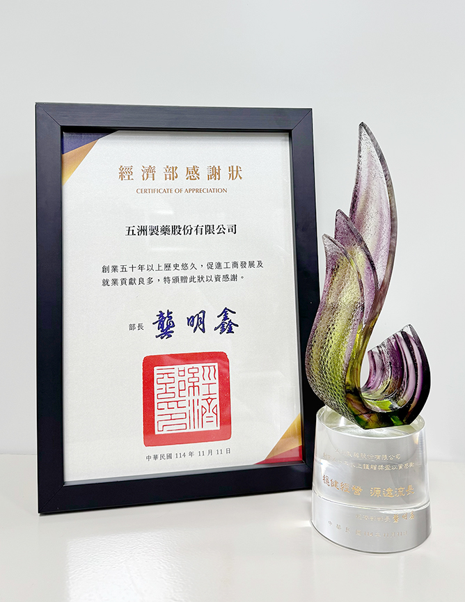 今年,五洲製藥再次榮獲經濟部頒發「創業五十年以上歷史悠久企業感謝狀」,這不僅是對公司長期深